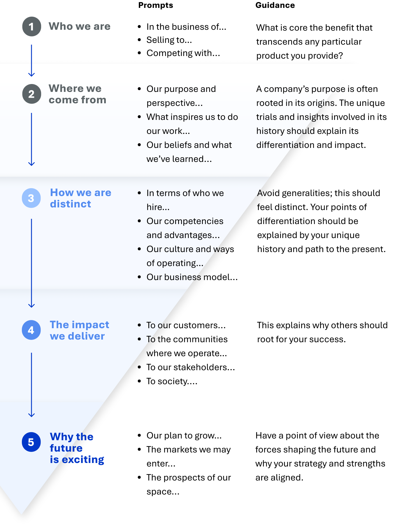 Building narrative architectures involves working through sequential story elements that ladder up to a bigger story. These building blocks should be enduring and evergreen. They should remain true across different cycles and circumstances. Different situations call for their own unique structures: advocacy narratives differ from investor narratives, which differ from industry positioning. For corporate narratives, we use the following framework: